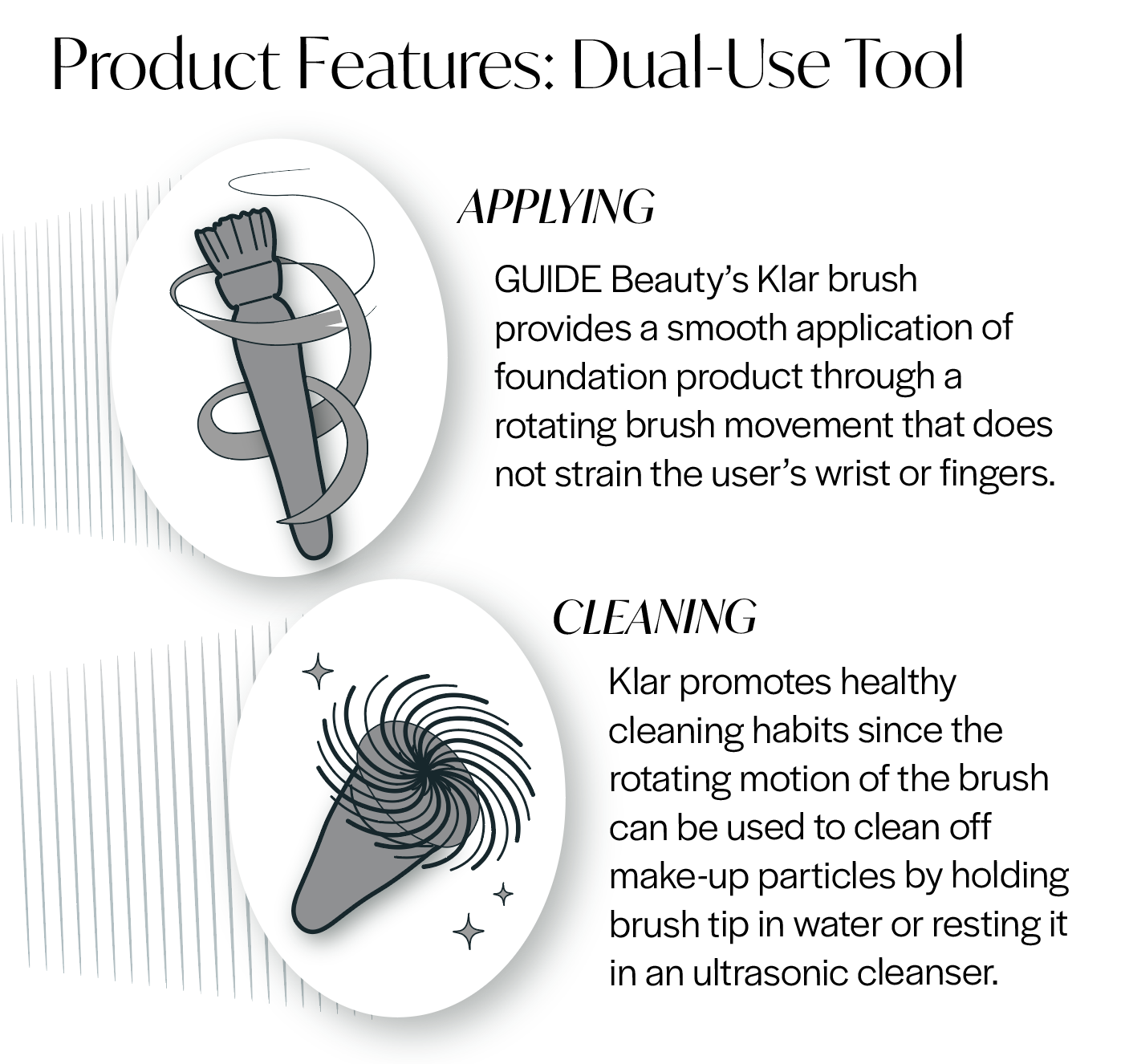 klar serves as a tool that helps people with dexterity issues. With its motorized function to help blend makeup and later clean off the product in a cleanser, there are less hand movements required by users and strain on wrists lessens.